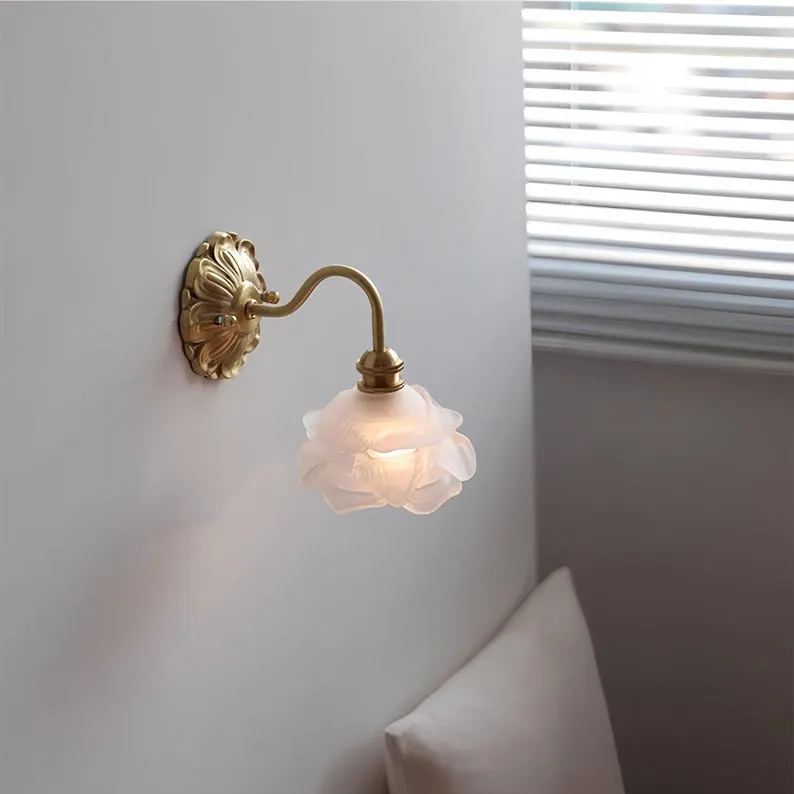 Flower wall sconce in white glass and antique brass, milky white glass